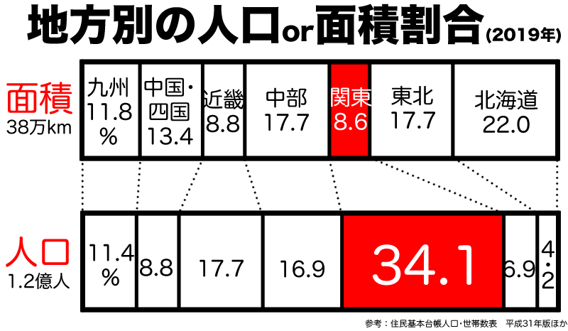 面積的にはそんな、なのに日本人口の約3分の1が関東に暮らしとんのや。