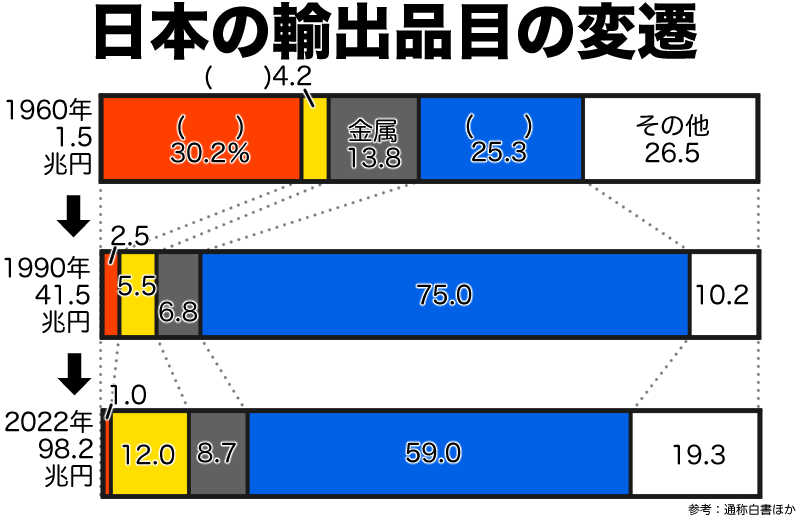 そんな中、日本は軽工業から重工業そして先端技術産業へとメイン貿易品が変化していった。