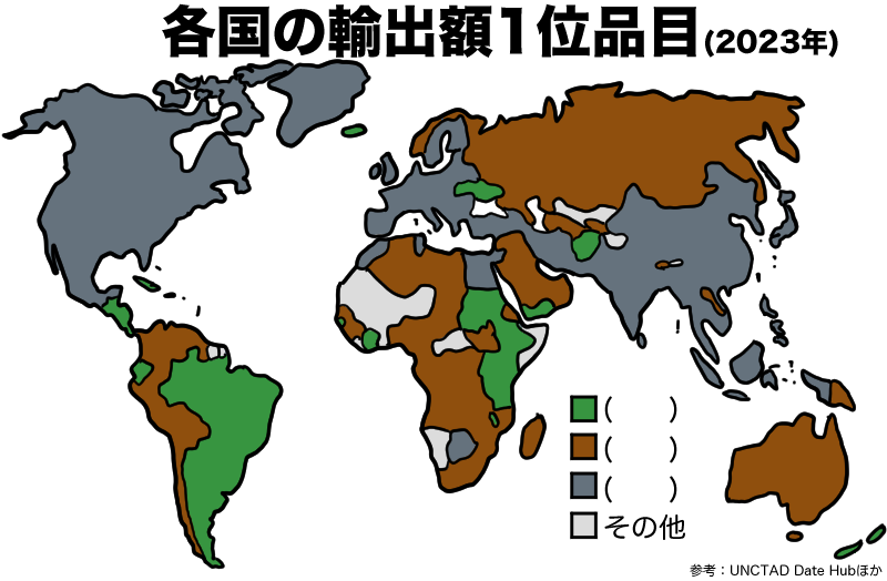 農業が盛んなブラジル、アルゼンチン、ウクライナの穀物、ガーナのカカオ豆などが該当する食料品が当てはまる。