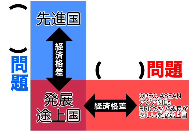 さっき出てきたOPECやASEAN、それに近年成長が著しいBRICSとそれ以外の一次産品輸出に頼っとる発展途上国間での経済格差が広がっており、これを南南問題っちゅう。